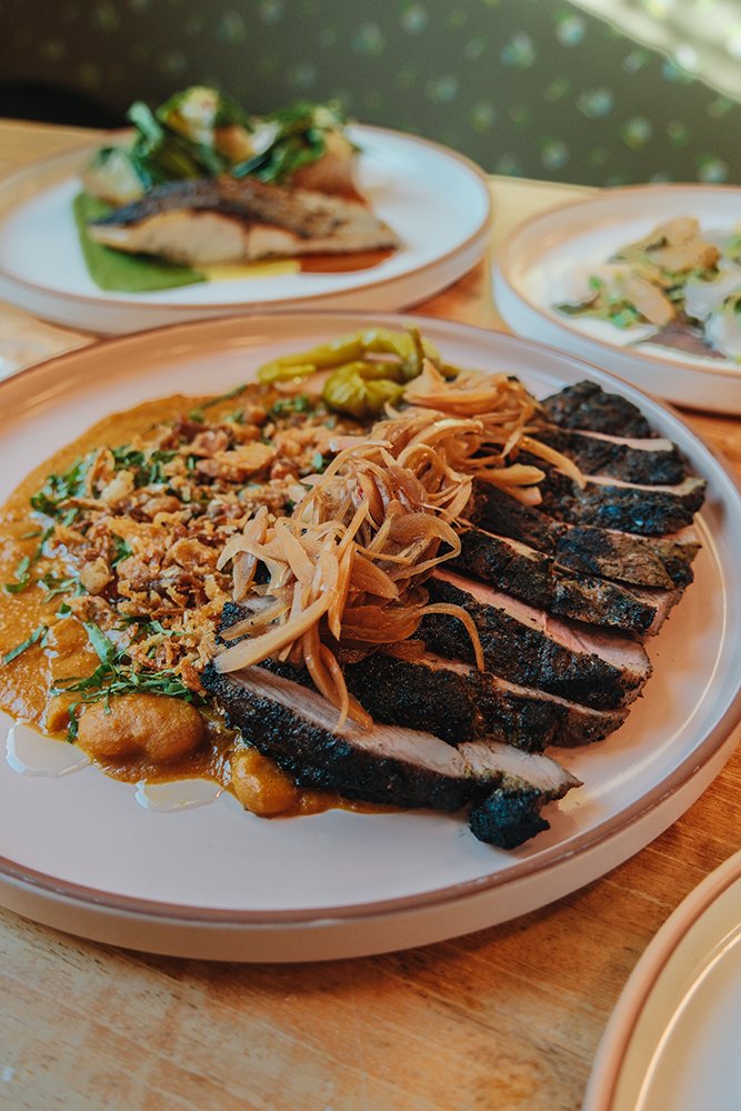 marinated in guava leaves, piparra & pickled shallot, braised butter beans, culantro, pork fat crunch